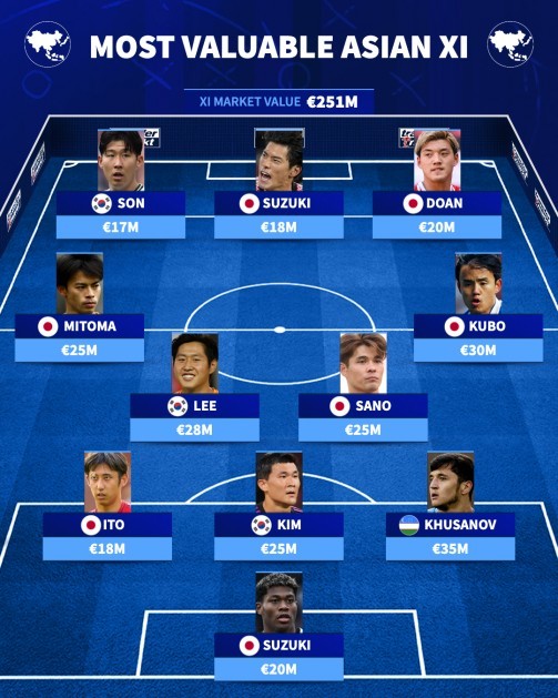 The right midfielder is Takefusa Kubo (30 million euros), and the left midfielder is Kaoru Mitoma (25 million euros), both from the Japanese team. South Korean legend Son (17 million euros) and Japanese stars Keito Nakamura (18 million euros) and Ritsu Doan (20 million euros) form the front three. Japan is the most dominant country in this lineup, with seven players selected, and the total value of the entire lineup is 251 million euros.