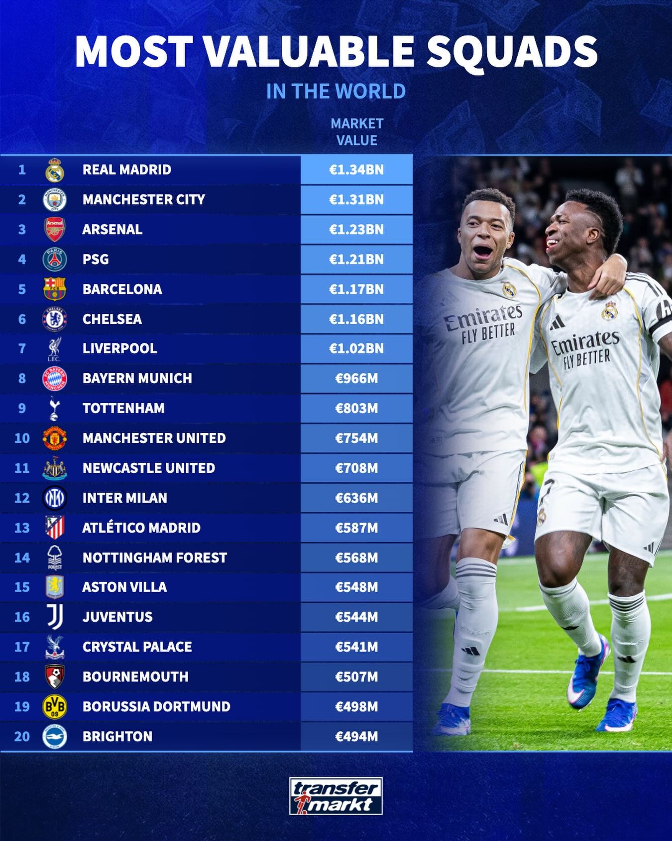 Transfermarkt lists the 20 most valuable squads after market value updates