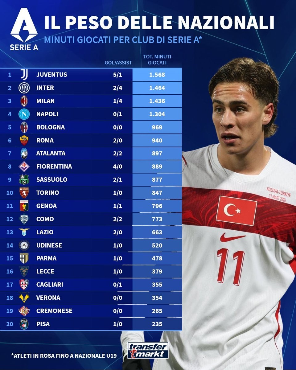 On April 2, Transfermarkt listed Serie A team in March international match day by players appearance time list, Juventus players a total of 1568 minutes ranked first, Inter, Milan and Napoli ranked second to fourth.