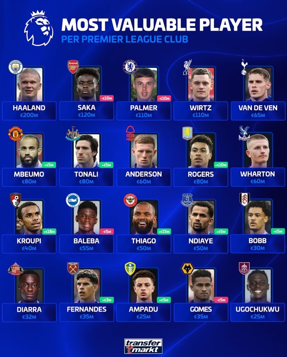Transfermarkt lists the most valuable player at each PL club: Haaland tops