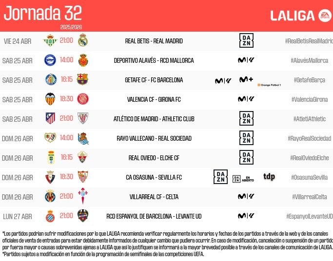 北京时间4月4日,西甲官方公布了联赛第32轮各场比赛的具体开球时间。