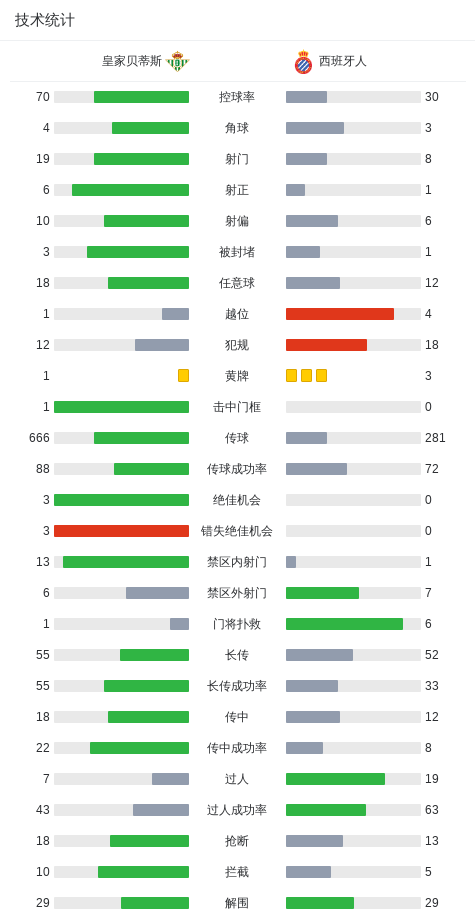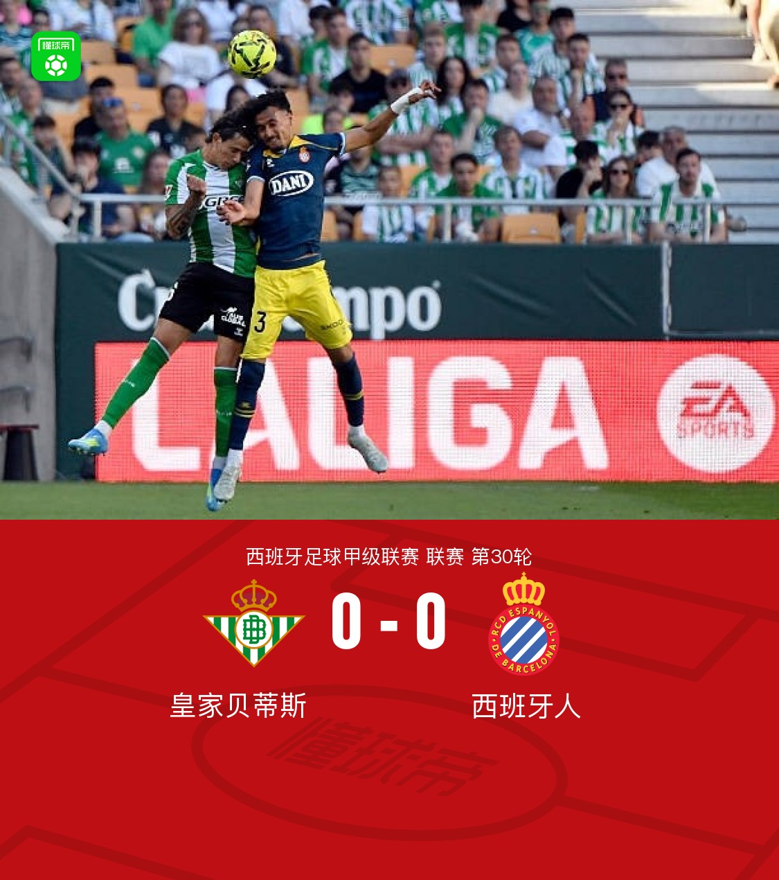 北京时间4月5日西班牙足球甲级联赛第30轮,皇家贝蒂斯主场对阵西班牙人。下半场巴勃罗-加西亚禁区打门击中横梁,双方未能把握机会取得进球。最终比分皇家贝蒂斯 0-0 西班牙人。