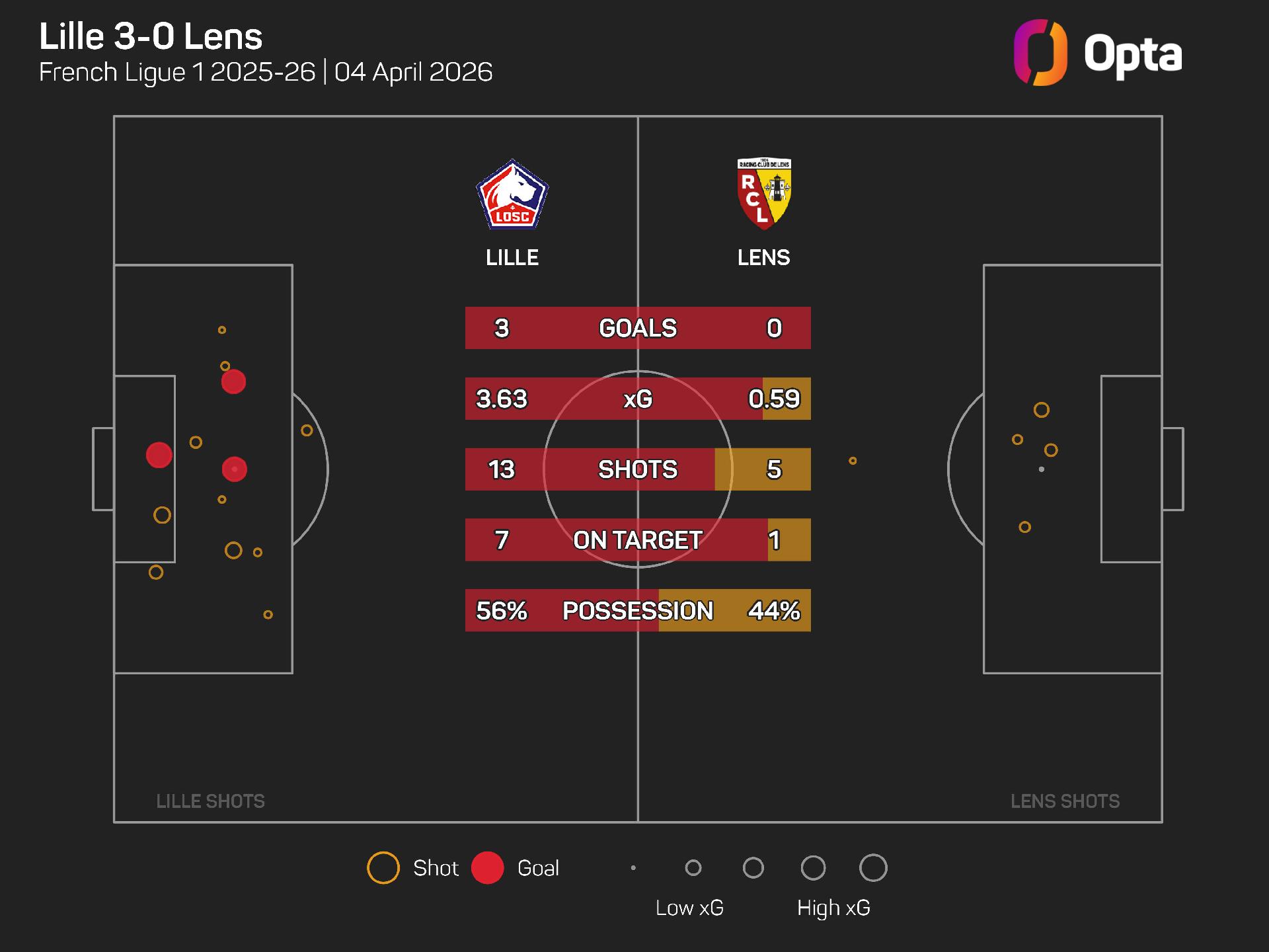 Bruno Genesio's hosts were deserved victors after attempting 13 shots and tallying 3.63 expected goals (xG), with Lens only putting up a paltry 0.59 xG.
