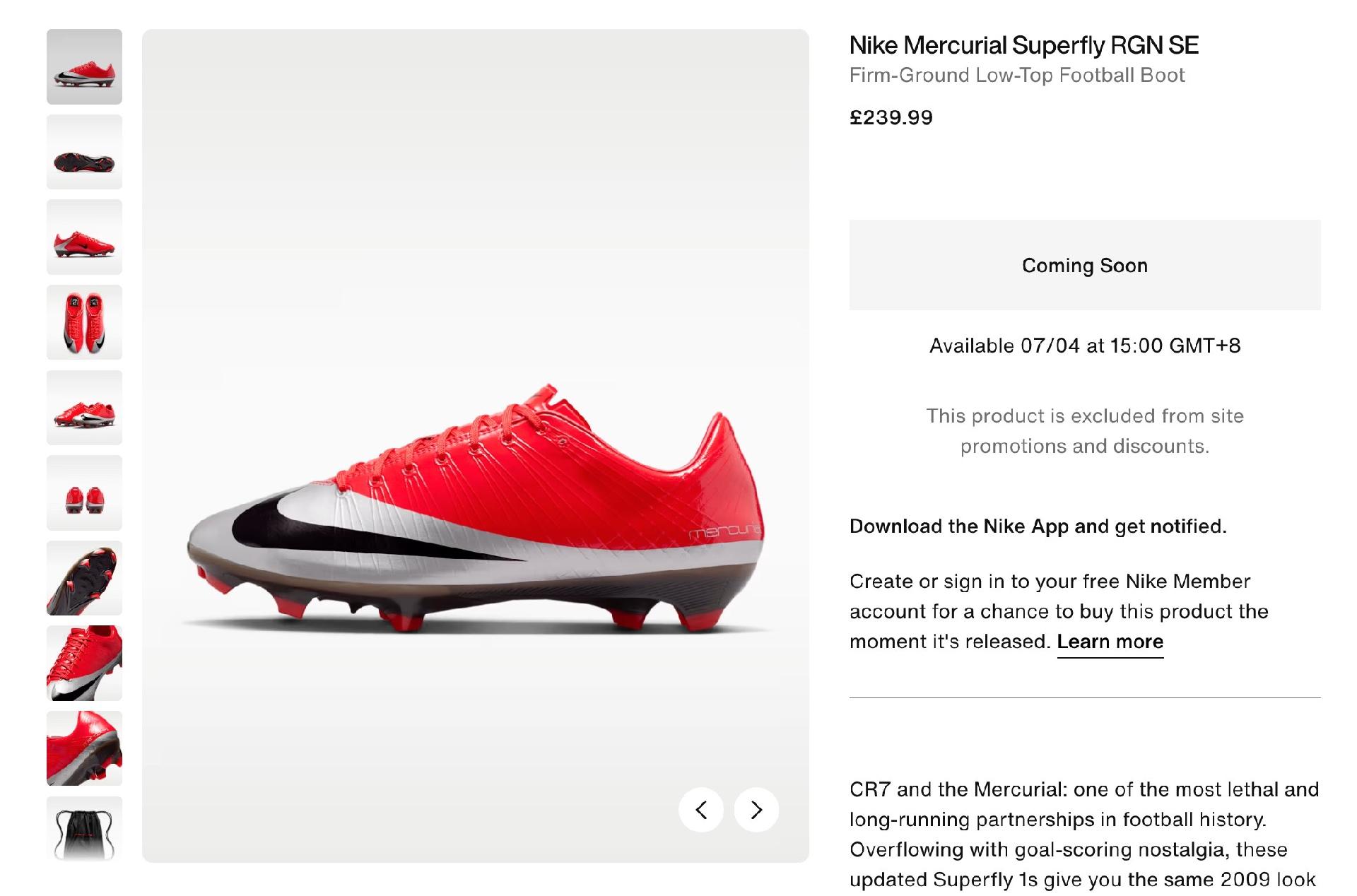 耐克官方与C罗社交媒体合作发布了全新Superfly RGN球鞋,并宣布将于4月7日正式发售。