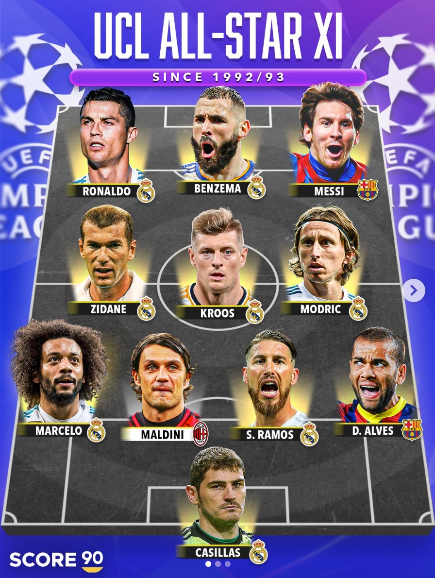 北京时间4月6日,Score90列出了自1992-93赛季改制以来欧冠的全明星阵容,C罗和梅西领衔,皇家马德里占据8席。
