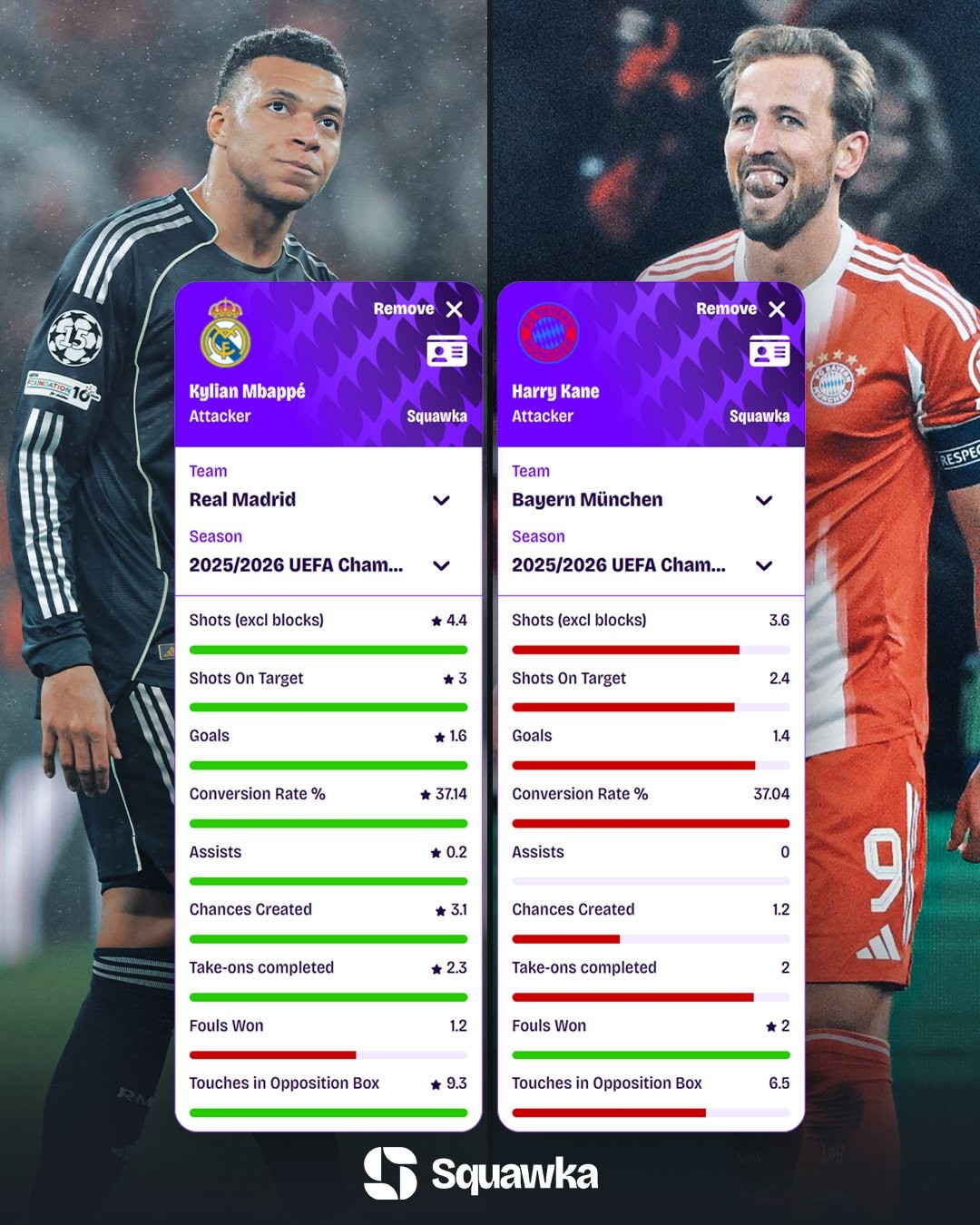 姆巴佩、凯恩欧冠每90分钟数据对比
