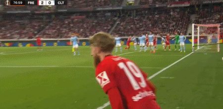第10分钟,曼赞比横传,格里福兜射破门先拔头筹,弗赖堡1-0塞尔塔