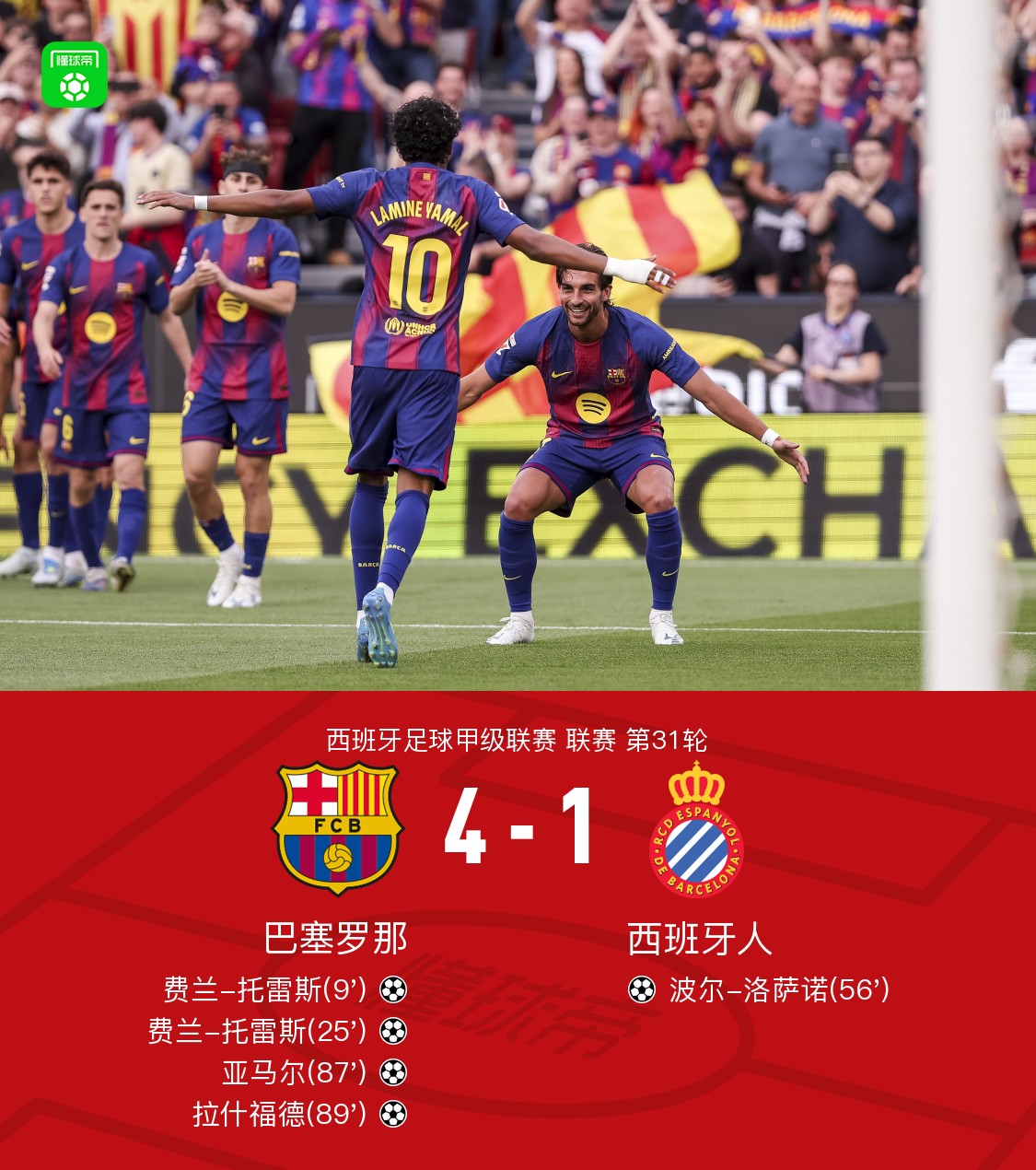 根据统计,加泰德比是亚马尔职业生涯第100次在西甲登场,这位西班牙天才也就此以18岁272天的年纪超越了皇马的传奇球星劳尔,成为西甲历史达成百场里程碑最年轻的球员。