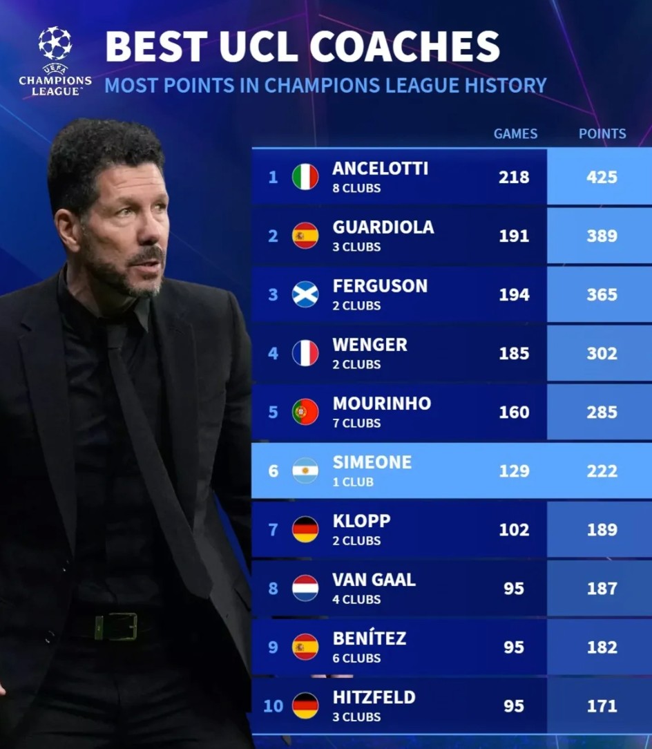 欧冠历史主帅拿分榜:安帅执教8队425分第1,西蒙尼222分第6