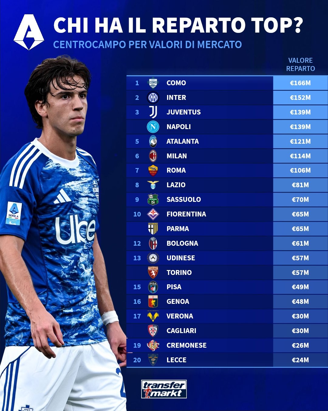 北京时间4月15日,德转统计意甲20队三条线的球员身价排名,防线上国际米兰位列第一,中场科莫领跑,锋线则是尤文图斯身价最高。