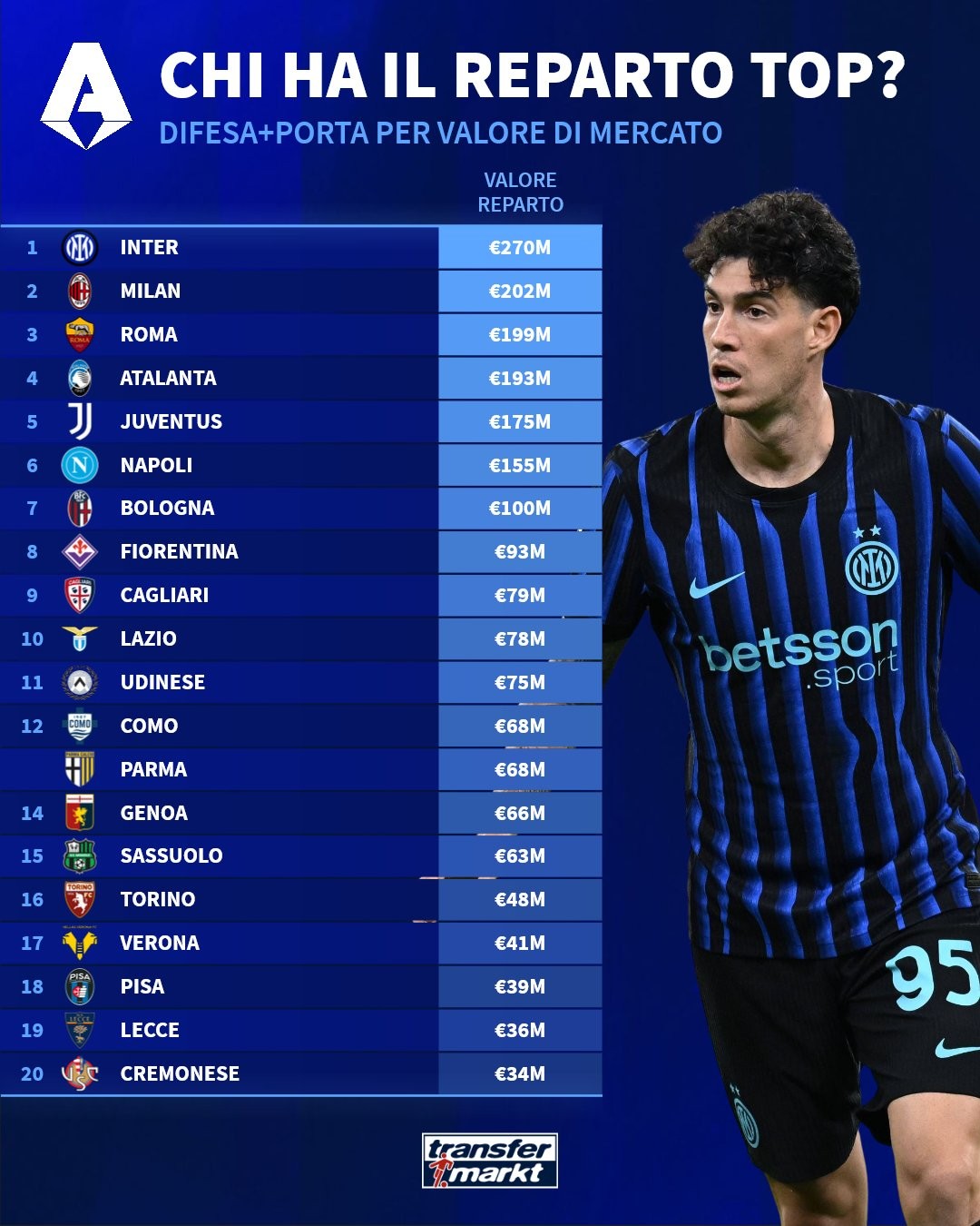 德转列意甲俱乐部三条线身价:国米防线第一,尤文锋线最高