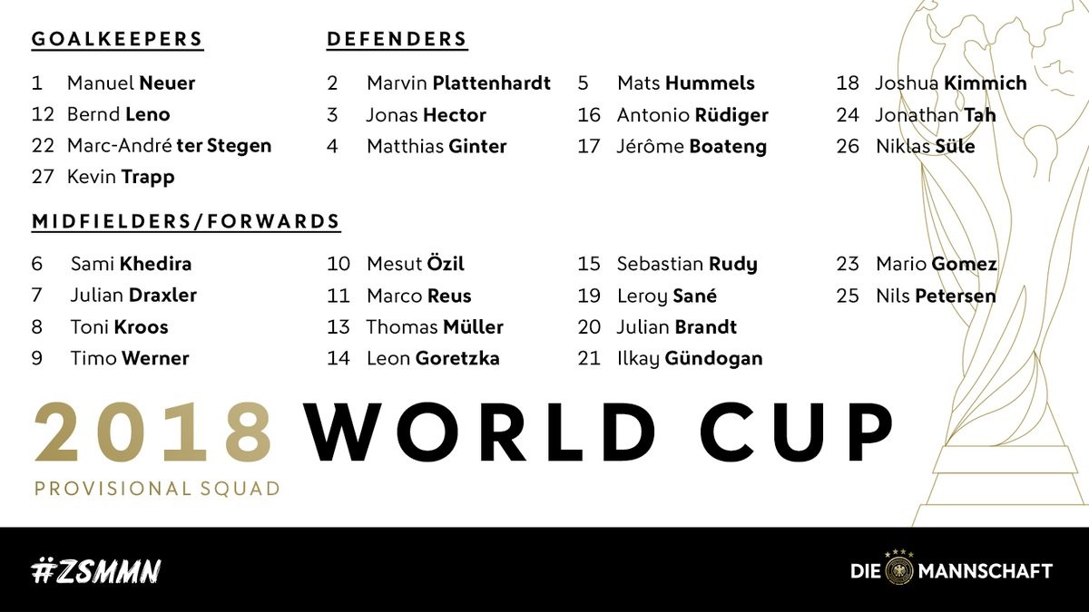 Bernd Leno (Bayer Leverkusen), Manuel Neuer (Bayern Munich), Marc-Andre ter Stegen (Barcelona), Kevin Trapp (Paris Saint-Germain); Jerome Boateng (Bayern Munich), Matthias Ginter (Borussia Monchengladbach), Jonas Hector (Cologne), Mats Hummels (Bayern Munich), Joshua Kimmich (Bayern Munich), Marvin Plattenhardt (Hertha Berlin), Antonio Rudiger (Chelsea), Niklas Sule (Bayern Munich), Jonathan Tah (Bayer Leverkusen); Julian Brandt (Bayer Leverkusen), Julian Draxler (PSG), Leon Goretzka (Schalke), Ilkay Gundogan (Manchester City), Sami Khedira (Juventus), Toni Kroos (Real Madrid), Mesut Ozil (Arsenal), Sebastian Rudy (Bayern Munich); Mario Gomez (Stuttgart), Thomas Muller (Bayern Munich), Nils Petersen (Freiburg), Marco Reus (Borussia Dortmund), Leroy Sane (Manchester City), Timo Werner (RB Leipzig).