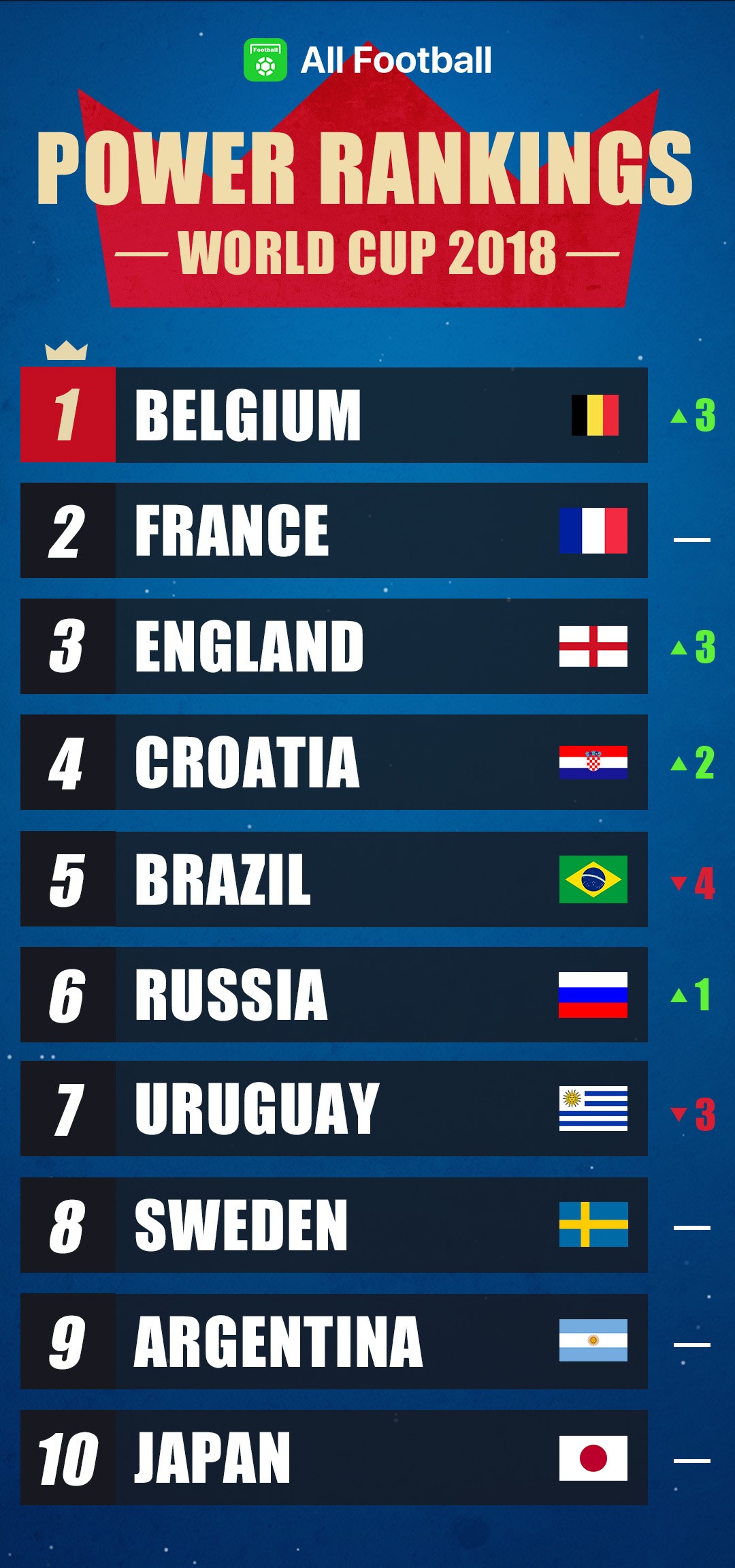Hello again, the FIFA World Cup is finally here! After every round of the tournament, we will bring you an updated power rankings, telling you who is in form, who is out of form and who is ready to win the greatest sporting event on Earth.