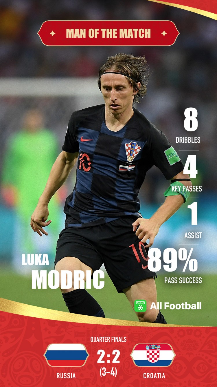 Croatia captain Luka Modric wins All Football Man of the Match award as Croatia beat Russia in the penalty shootout to reach the semi-final.