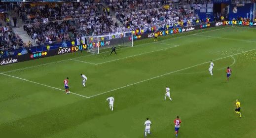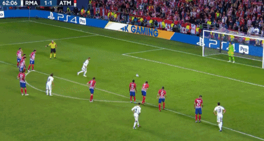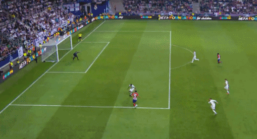 Racing down the right flank, his right-footed delivery is wicked. It catches Atletico out, and Benzema is at the back post to neatly head past Oblak at the far post.
