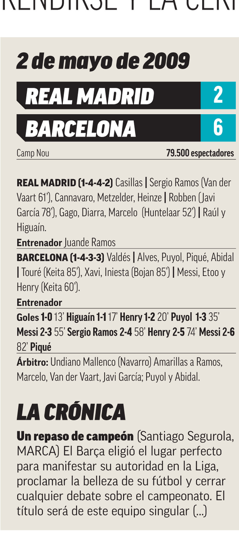 La historia de la Liga está llena de marcadores impactantes. El 12-1 del Athletic al Barça (1931), el 9-5 entre los leones y el Racing (1933), el 11-1 del Sevilla a los azulgranas (1940), el 10-2 del Madrid al Rayo (2015)... En la era moderna hay uno que por su contexto, (rivalidad máxima y la Liga en juego) quedará para siempre en la historia del fútbol español: el 2-6 con el que el Barcelona sentenció el título en el Bernabéu el 2 de mayo de 2009.