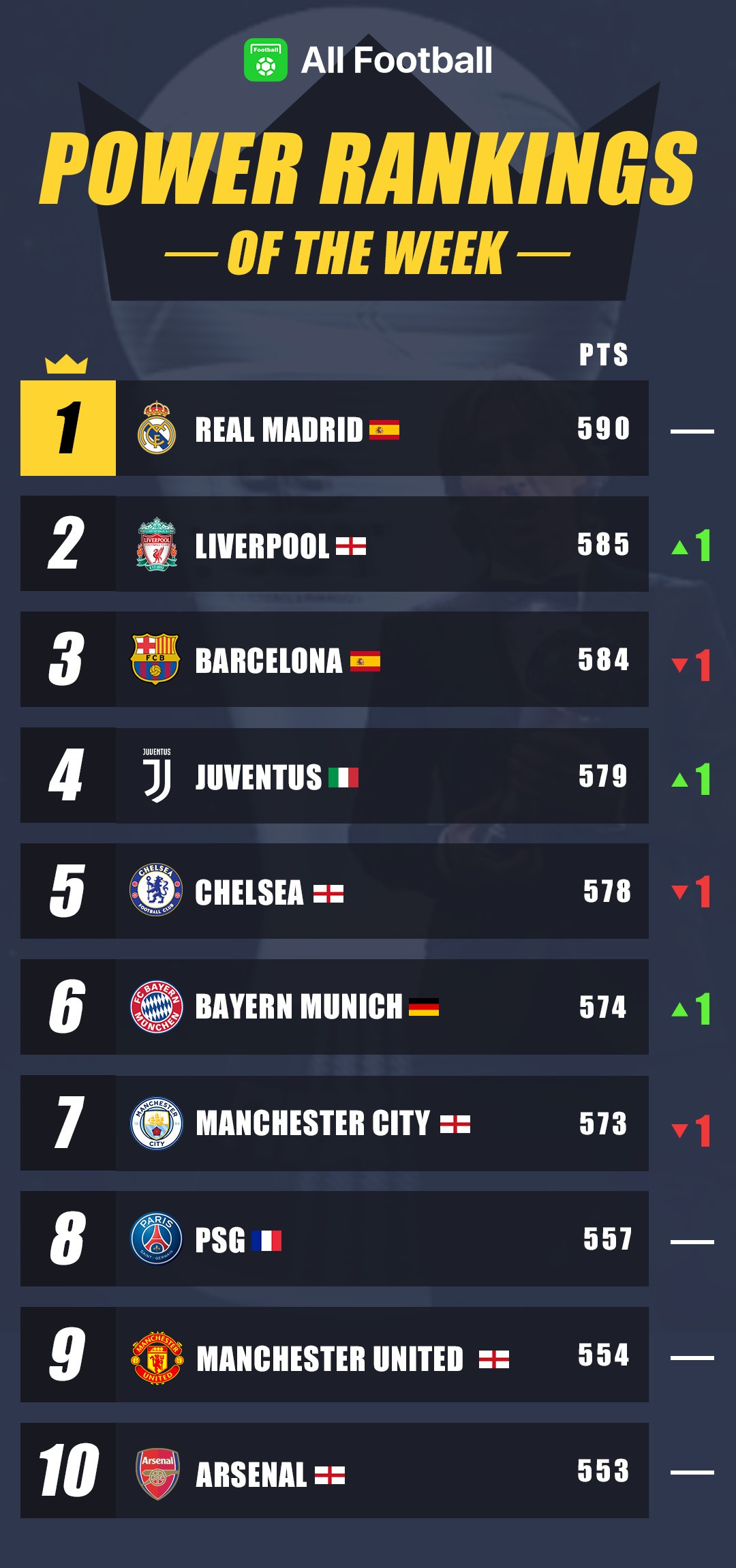 Hello again! We organize clubs of Europe's top 5 leagues into an order that reflects the up-to-the-minute hierarchy every Tuesday.