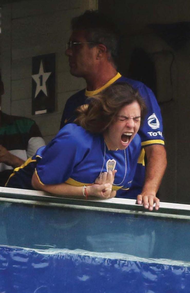 Menditeguy no fue la única celebrity que el domingo pasado alentó al equipo azul y oro. Dalma Maradona; Guillermo Cóppola, Juan Martín Del Potro, Andy Kusnetzoff y Leo Montero se sumaron a la tribuna de famosos que aplaudieron a su equipo favorito. Embarazada de cinco meses, la hija del Diez no se privó de gritar a todo pulmón los tantos de Boca junto a su marido, Andrés Caldarelli, su hermana Gianinna y su sobrino, Benjamín Agüero. Enamorados del fútbol, los hinchas transformaron el encuentro en una verdadera fiesta.