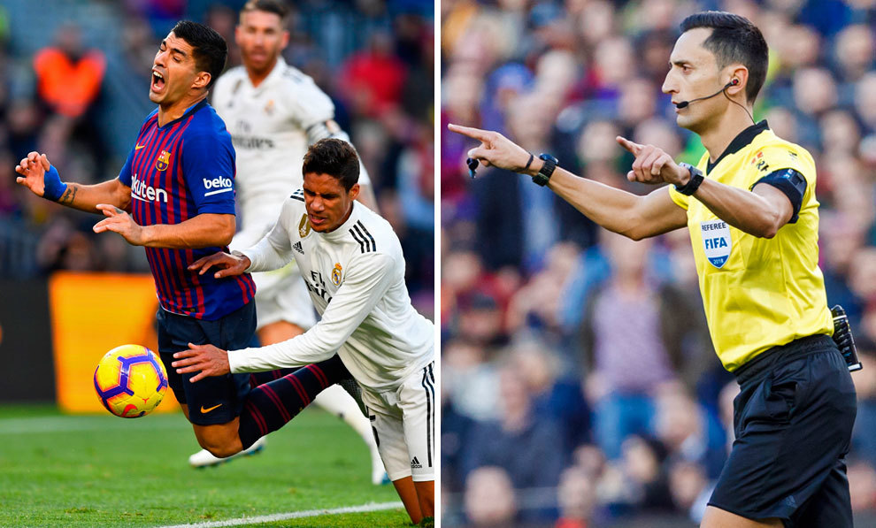 "Varane no toca balón. Varane golpea a Luis Suárez", le dice a Sánchez Martínez mientras corre para visualizar la jugada en la pantalla. "¿A ver el contacto? Para mí correcto. Vale, perfecto. Sí, penalti. Sin tarjeta", dice el colegiado mientras ve la acción que supuso el 2-0 del Barcelona ante el Real Madrid.