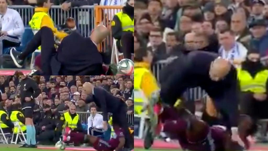 Alors qu'Aidoo se battait pour rattraper un ballon, le joueur n'a pas pu stopper sa course et a envoyé Zinédine Zidane au sol.