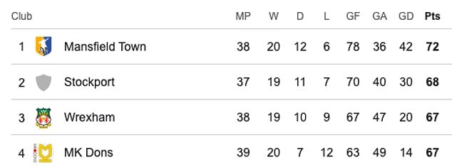 With seven games of the regular season left, they still have every chance of returning to League One automatically. Intriguingly, their run-in includes games against Stockport and Mansfield.