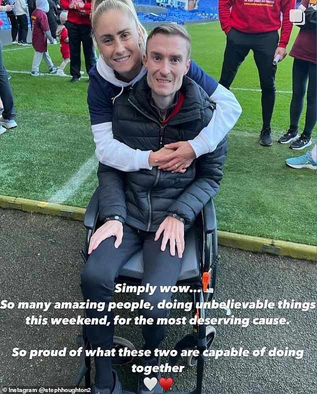 Former England captain Steph Houghton was joined by a host of footballing royalty as she pushed her husband Stephen Darby in a wheelchair to raise awareness for Motor Neurone Disease, which ended his career.