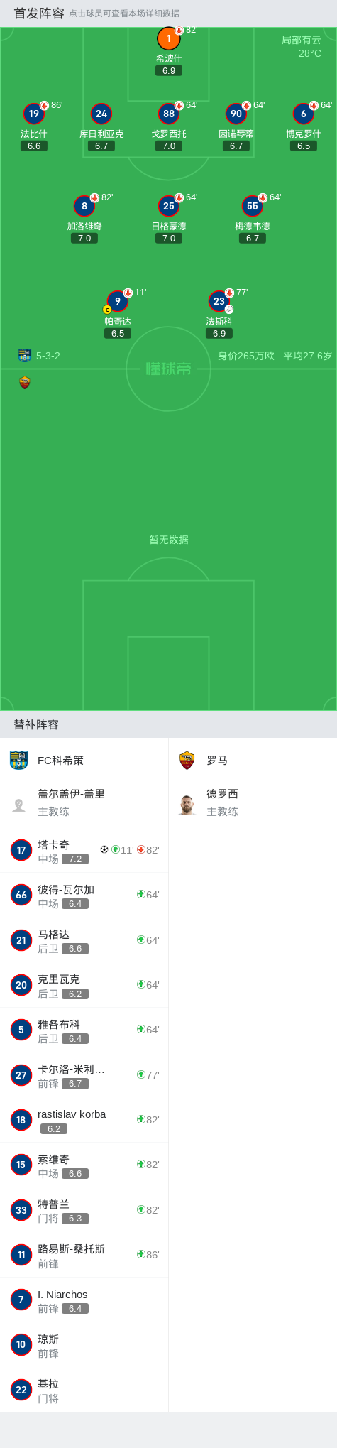 在7月23日进行的俱乐部友谊赛中,FC科希策与罗马展开了一场激烈的对决。上半场,法斯科任意球攻门打偏,安赫利尼奥任意球被封堵。下半场,达尔伯后场传球被断,塔卡奇推射破门,卡马低射被门将没收,皮西利推射破门扳平比分,最终,罗马1-1战平FC科希策。