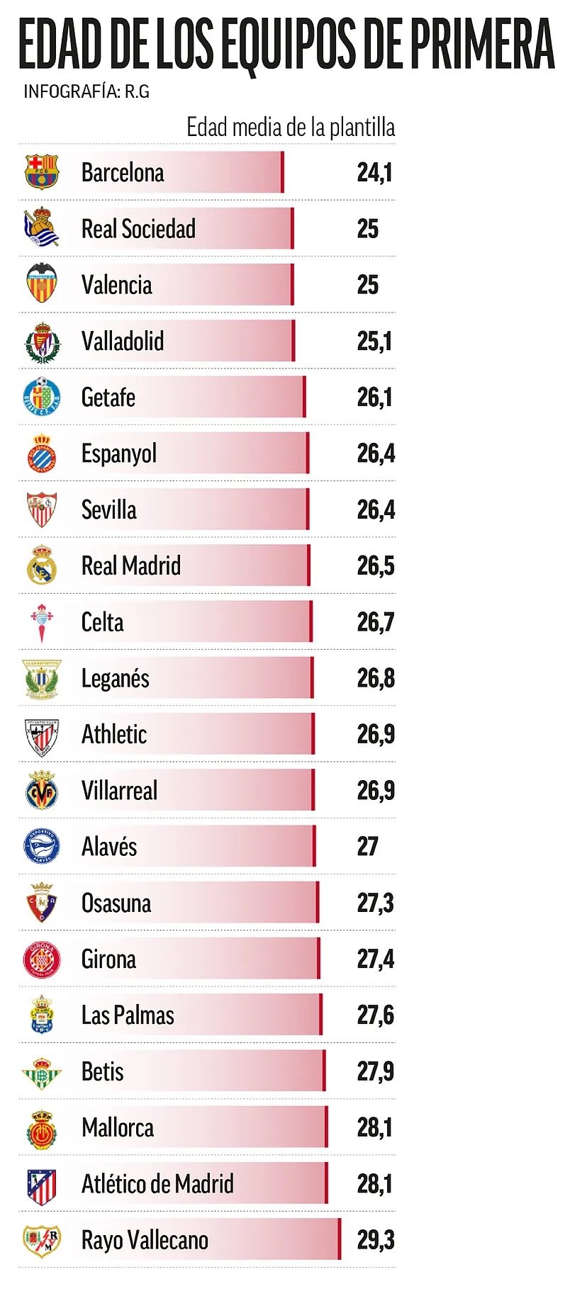 本赛季西甲球队平均年龄:巴萨24.1岁最低,皇马26.5岁
