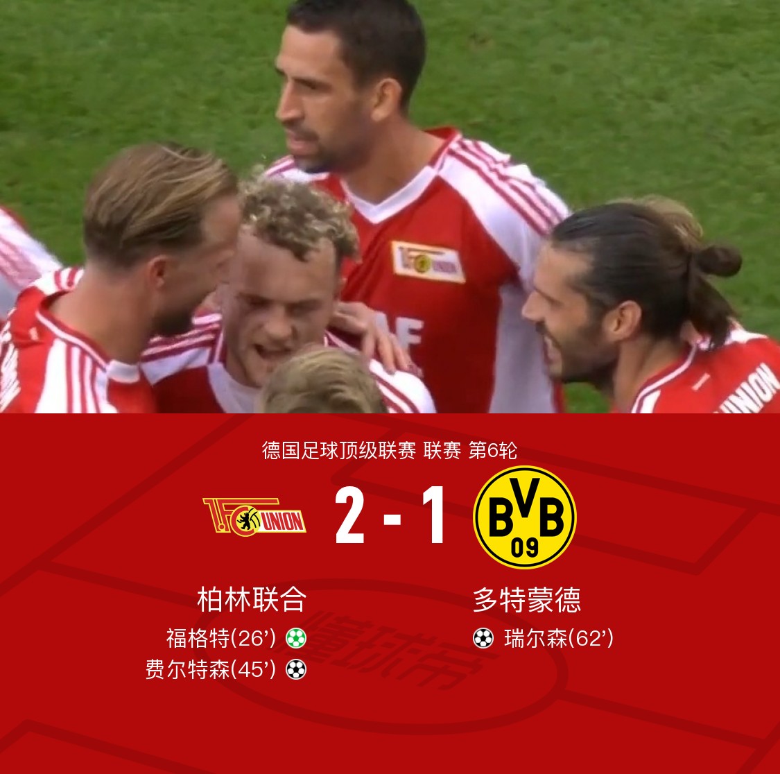 在德国足球顶级联赛第6轮的较量中,柏林联合坐镇主场迎战多特蒙德。上半场施洛特贝克送点,福格特点射破门,半场尾声费尔特森弧顶抽射破门扩大比分。下半场瑞尔森接布兰特妙传后破门扳回一球。最终,柏林联合以2-1战胜多特蒙德,取得胜利。
