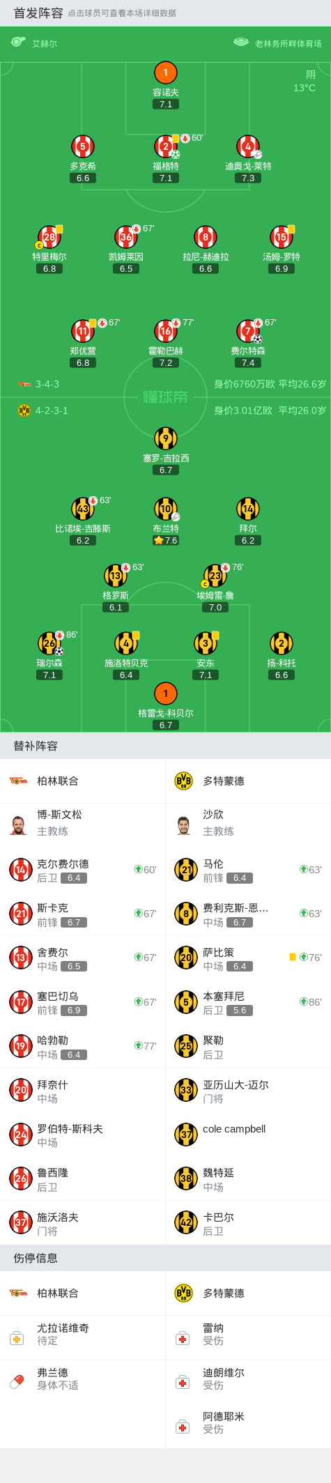 第45分钟,多特解围不远,费尔特森弧顶抽射破门,柏林联合2-0领先