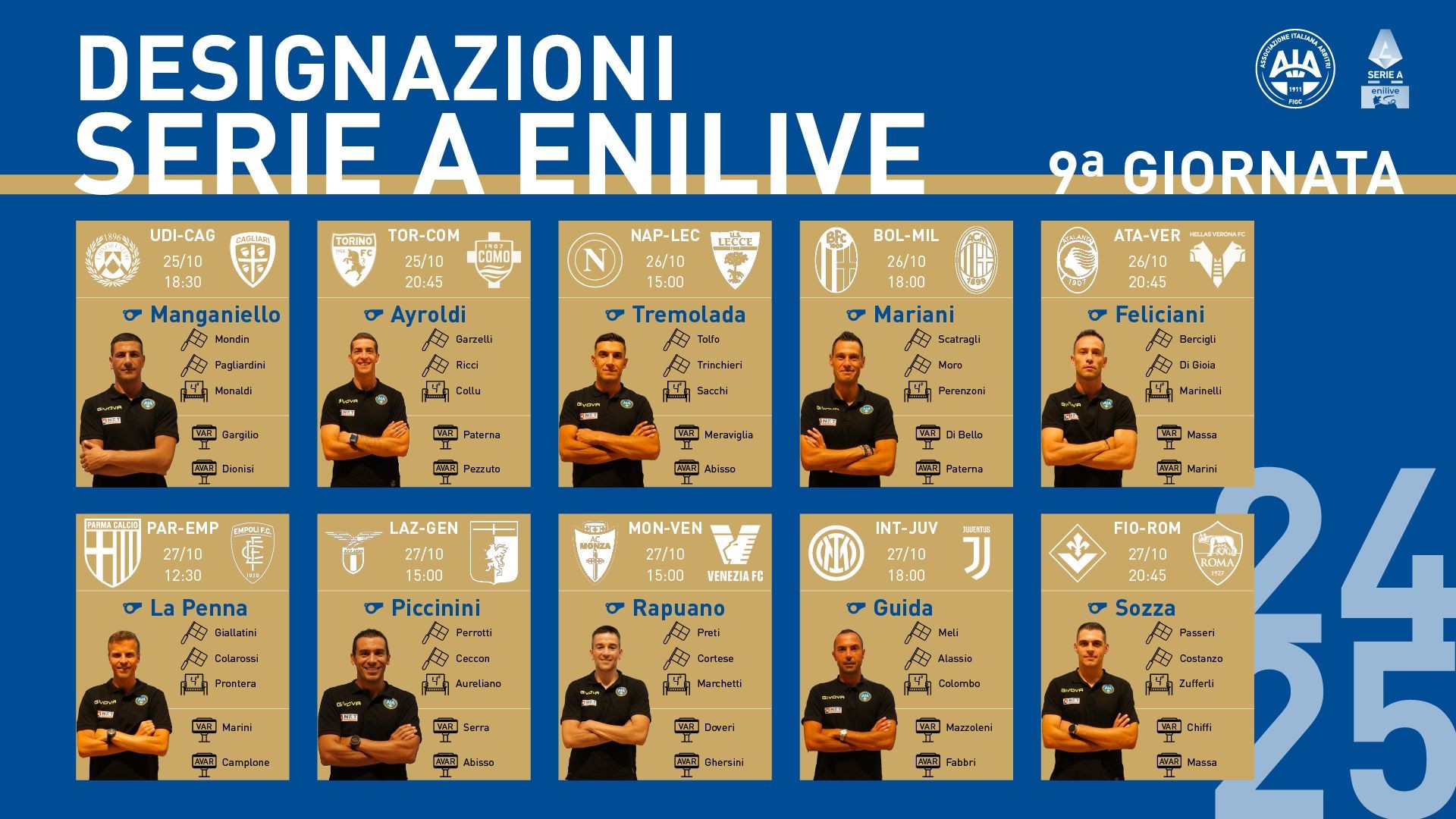 意大利裁判协会公布了意甲第9轮各场比赛的裁判员名单,本赛季首回合的意大利国家德比由圭达吹罚,马里亚尼执法AC米兰客战博洛尼亚,索扎执法佛罗伦萨vs罗马。