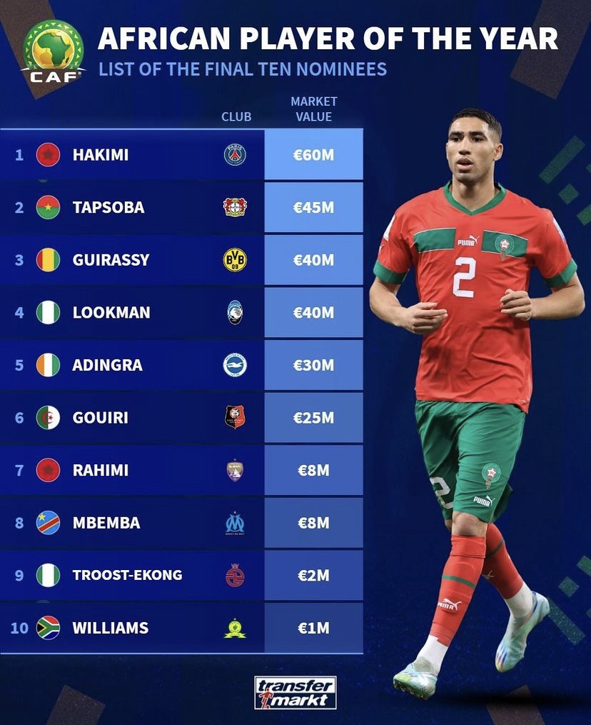 2024年非洲最佳球员的10位候选者已经公布,德转则统计出了这10名球员的身价,阿什拉夫以6000万欧元高居第一,身价最低的球员则是南非国门隆文-威廉斯,仅为100万欧元。