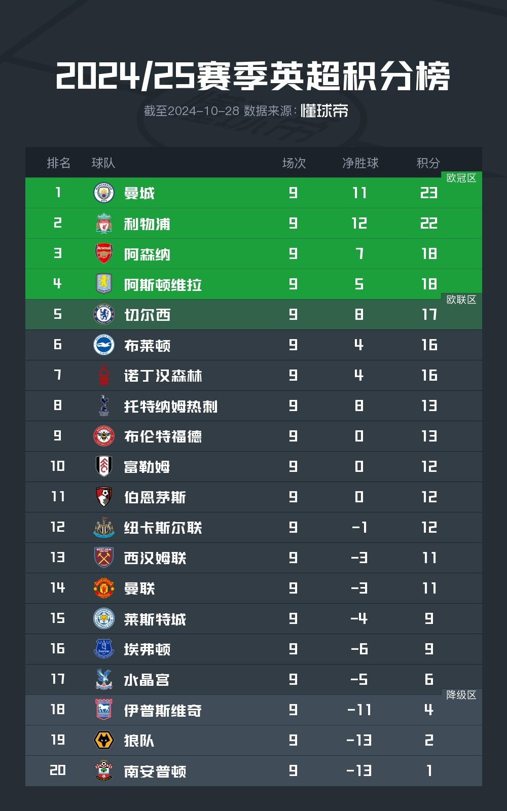 北京时间10月28日凌晨,2024/25赛季英超联赛结束了第9轮的全部较量,积分榜的情况也产生了新的变化。