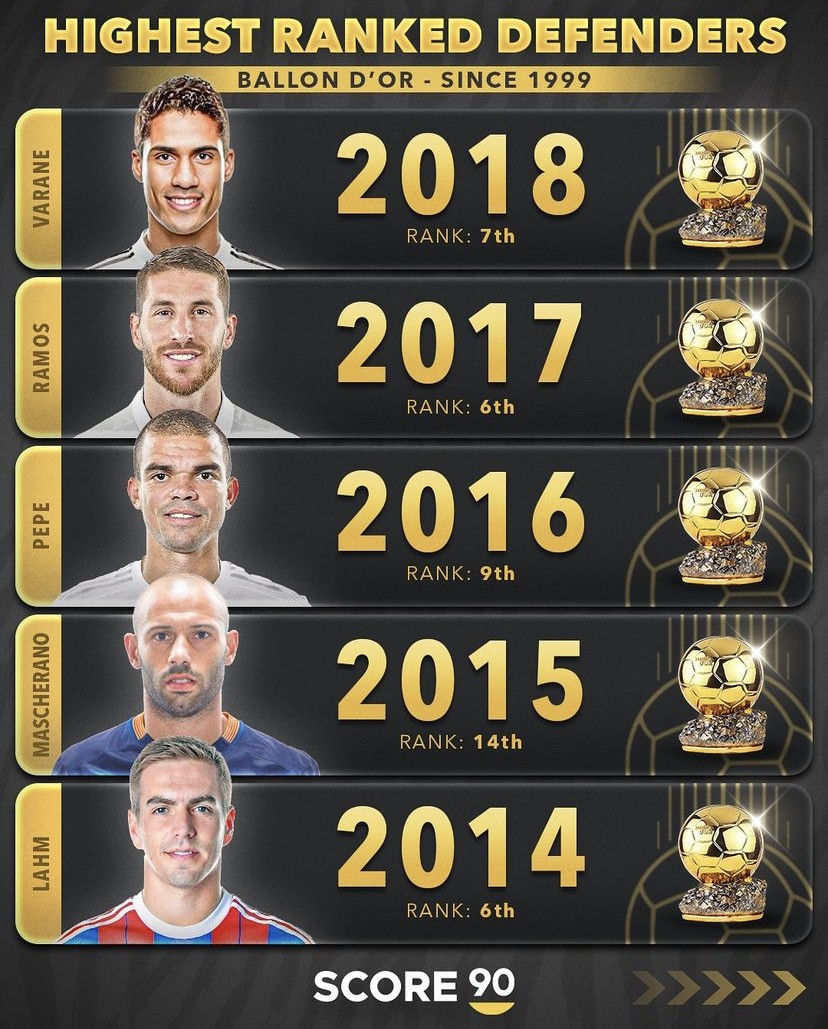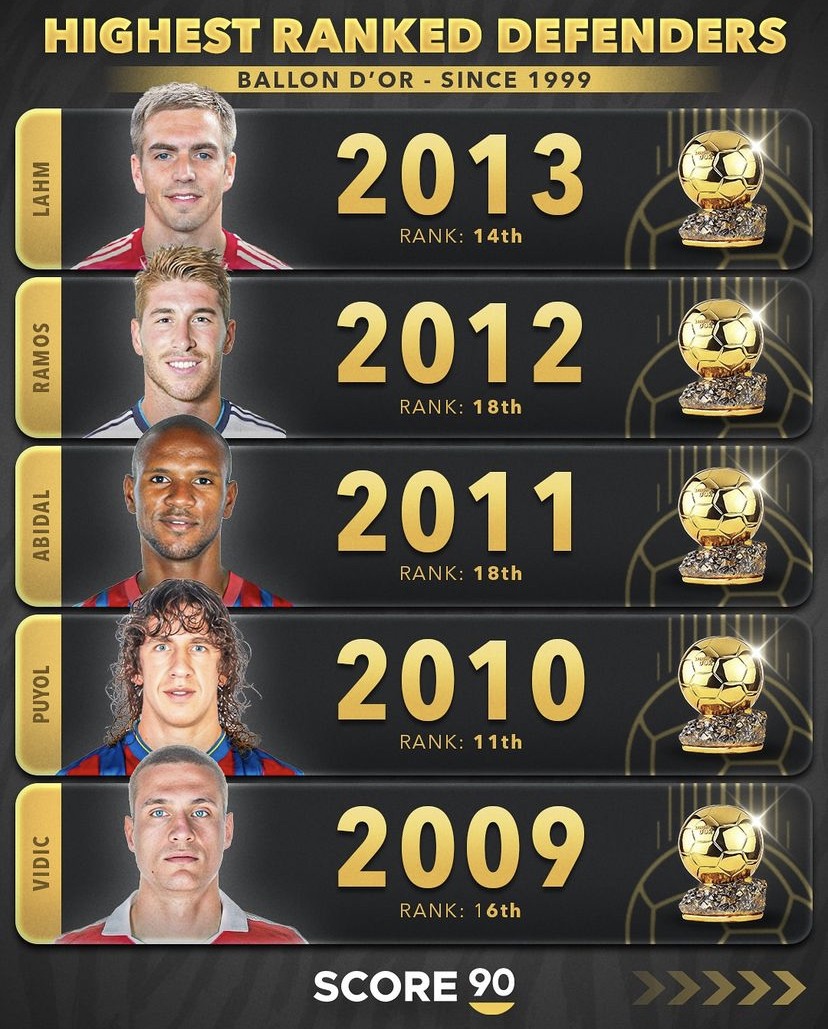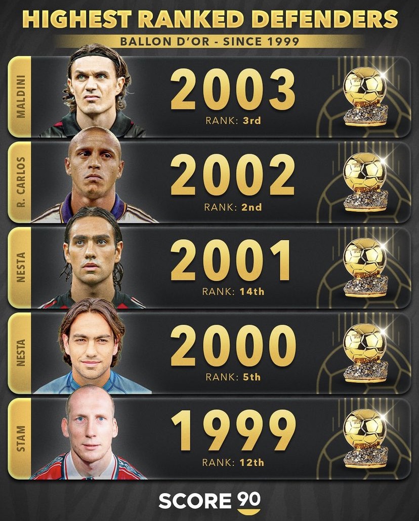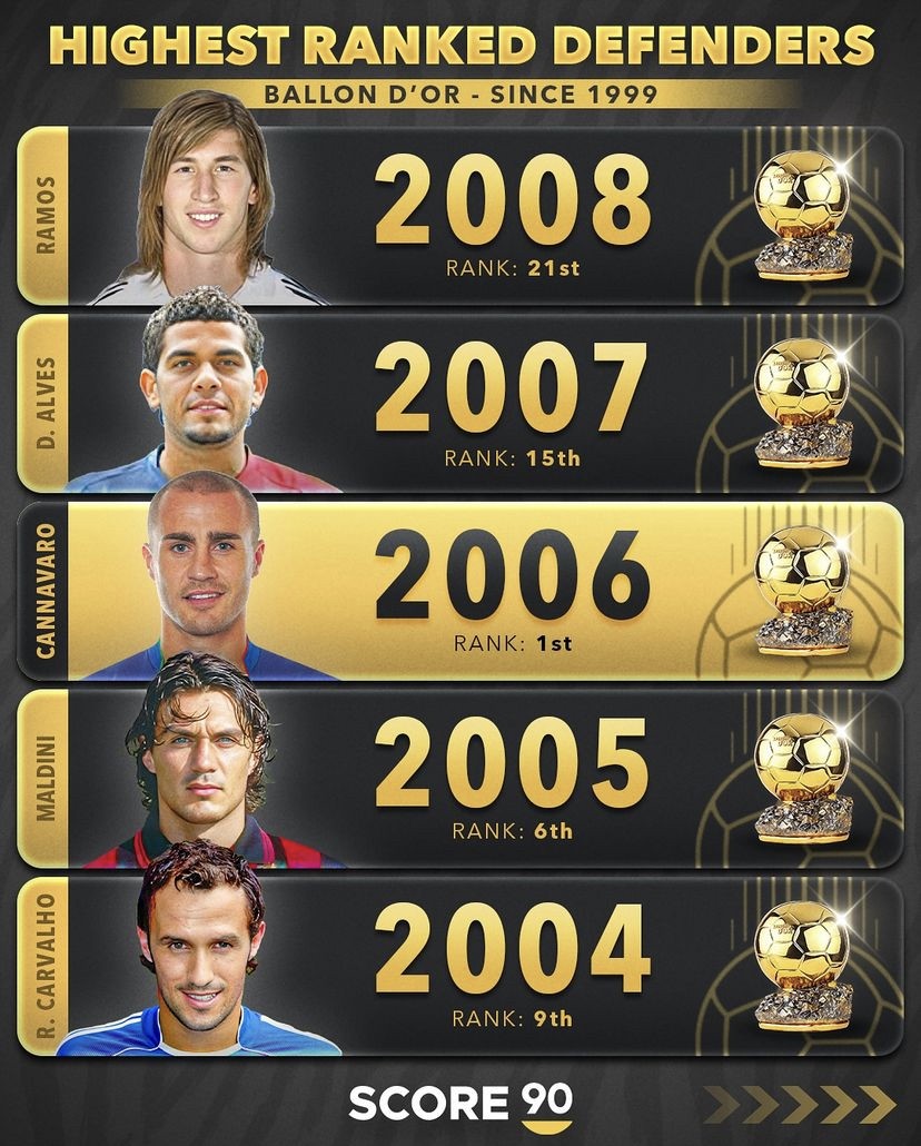 媒体score90统计出了自1999年以来历年金球奖评选名次最高的后卫,2006年的卡纳瓦罗是迄今为止唯一一名赢得过金球奖的后卫球员,2002年的罗伯托-卡洛斯和2019年的范戴克都曾在金球奖的评选中排名第二,保罗-马尔蒂尼在2003年金球奖的评选中曾位列第三,而2024年金球奖的评选卡瓦哈尔则排名第四。