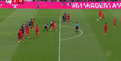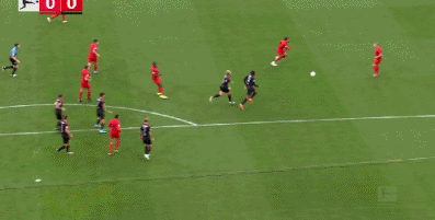 第38分钟,前场任意球配合,穆西亚拉横传,后点队友没有接应