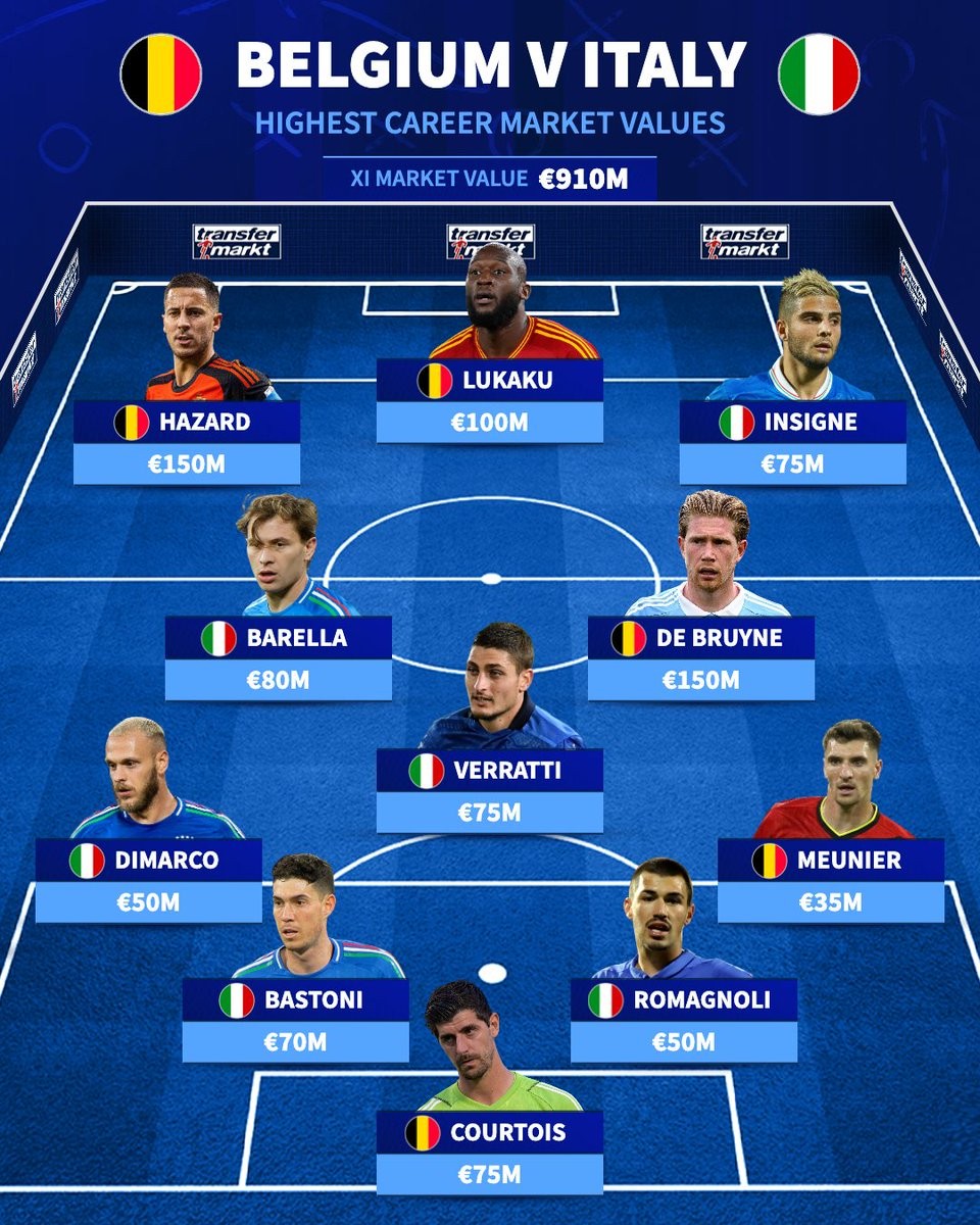 北京时间周五凌晨03:45,比利时和意大利将会在欧国联A级第五轮的比赛中展开较量,赛前德转统计出了两支球队历史最贵的11人阵容,阿扎尔、德布劳内以及卢卡库的最高身价都达到了1亿欧元的级别,意大利身价最高的球员则是巴雷拉。