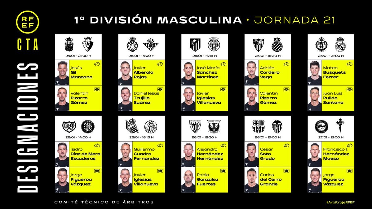 西班牙足协官方公布了西甲第21轮裁判安排,索托-格拉多将执法巴塞罗那vs瓦伦西亚,马特奥-布斯克茨将执法巴拉多利德vs皇家马德里。