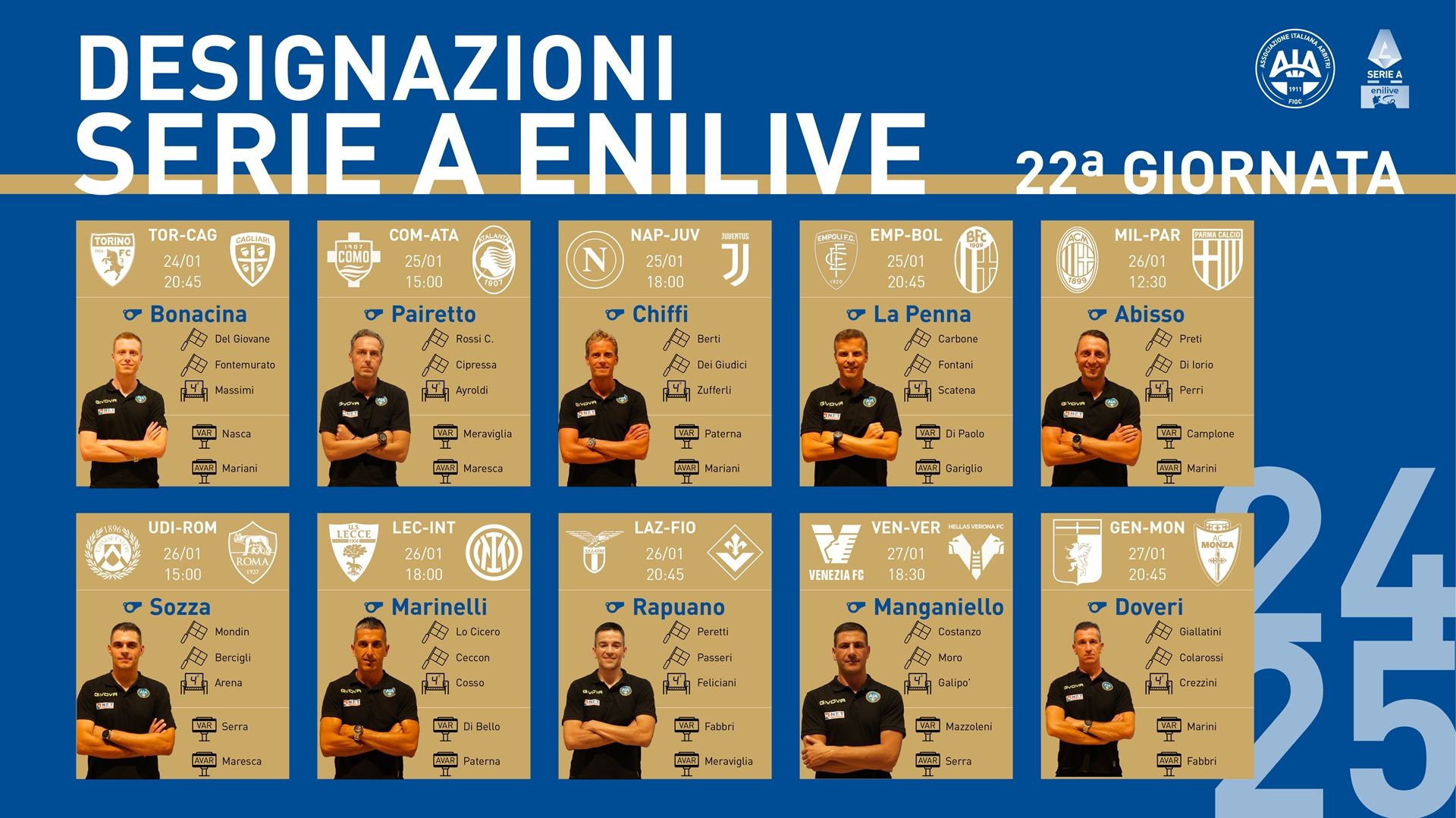 意甲第22轮各场比赛主裁判及VAR安排如下: