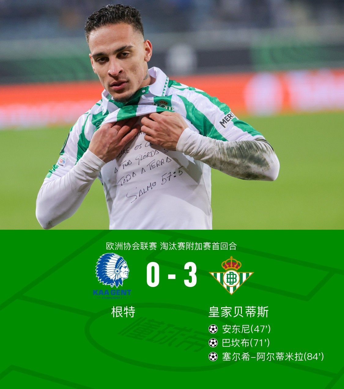 在欧洲协会联赛淘汰赛附加赛的首回合较量中,根特迎战皇家贝蒂斯。比赛中,皇家贝蒂斯展现了强大的进攻实力。首先,安东尼在萨巴利的助攻下成功破门,为球队首开纪录。随后,伊斯科助攻巴坎布,再次扩大了比分优势。比赛接近尾声时,巴坎布再次成为关键人物,他助攻塞尔希-阿尔蒂米拉,后者将球送入网底,锁定胜局。最终,皇家贝蒂斯以3比0的比分完胜根特。