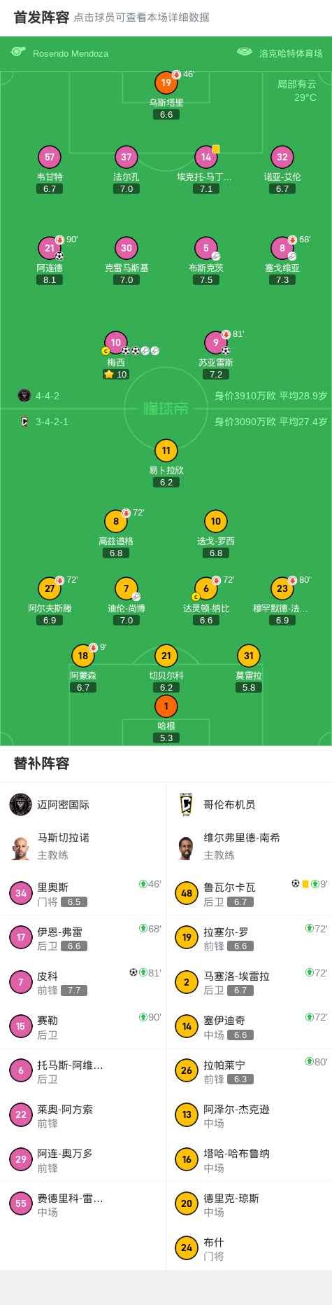 第13分钟,梅西长传身后球,阿连德单刀破门先拔头筹,迈阿密国际1-0
