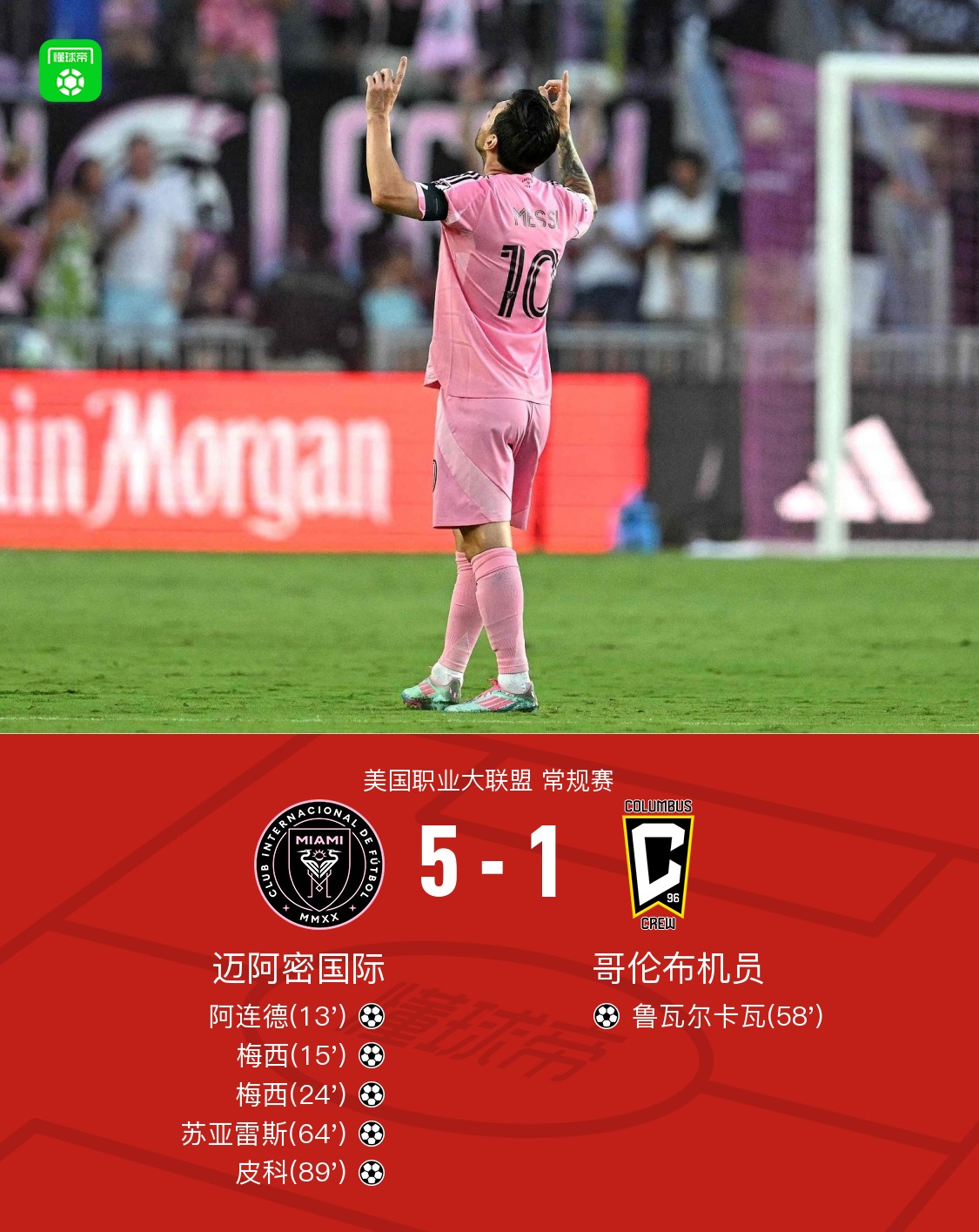 迈阿密国际5-1哥伦布机员,梅西双响+助攻,苏亚雷斯破门