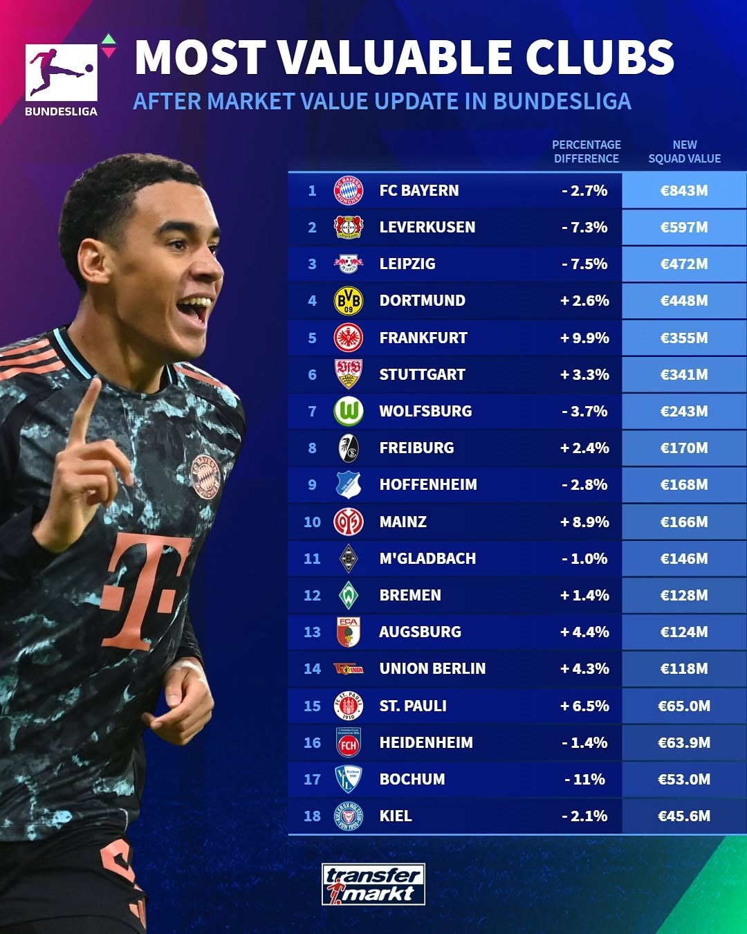 拜仁慕尼黑依旧高居榜首,尽管整体球队身价较上次更新下降2.7%,但仍达到8.43亿欧元。勒沃库森和莱比锡分列第二与第三,分别为5.97亿和4.72亿欧元。多特蒙德则以4.48亿欧元位列榜单第四。