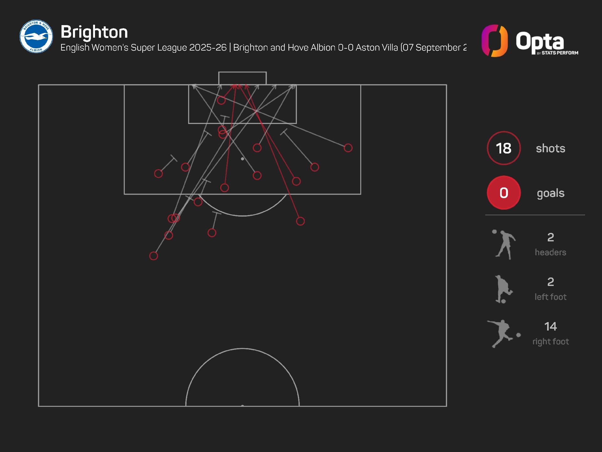Brighton were held to a goalless draw by Aston Villa despite attempting 18 shots at Sabrina D'Angelo's net, their third-most efforts without scoring in a WSL match (after 20 vs Birmingham City in January 2021 and 20 vs Bristol City in September 2019).