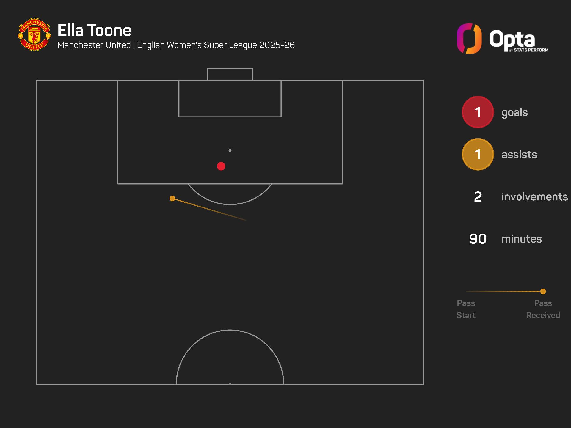 Indeed, since the start of 2025, only Elisabeth Terland (13 – seven goals, six assists) has recorded more league goal involvements for United than Toone (nine – six goals, three assists).