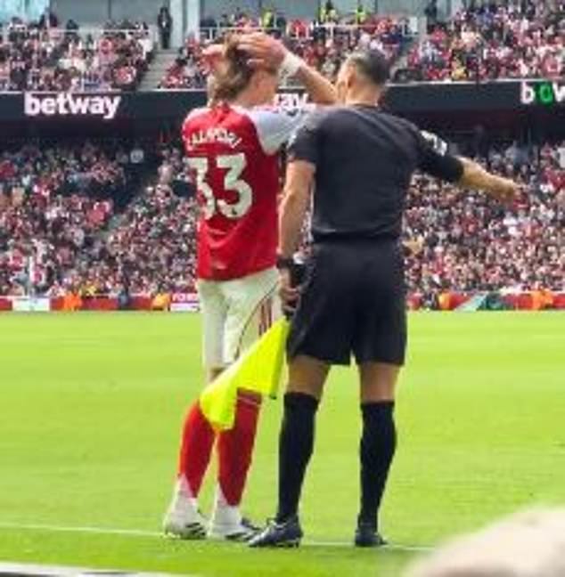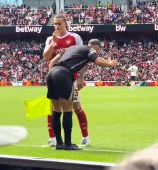 Away from the action on the pitch, eagle-eyed fans spotted a hilarious exchange between Arsenal left-back Riccardo Calafiori and one of the linesmen.