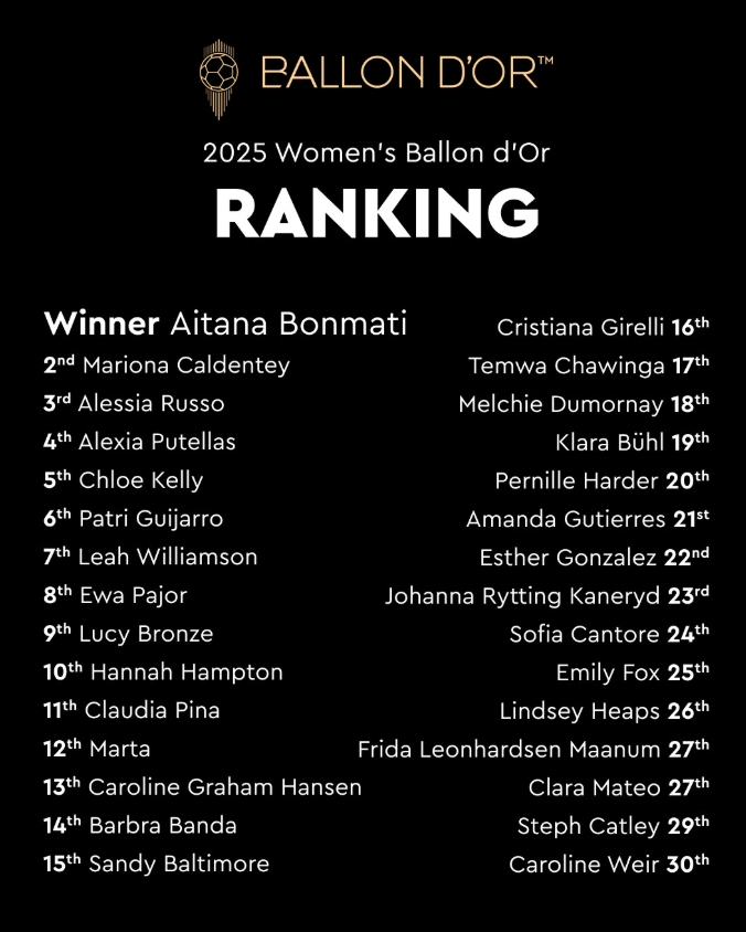 2025 Women's Ballon d'Or final results: Bonmati 1st, Mariona 2nd, Russo 3rd