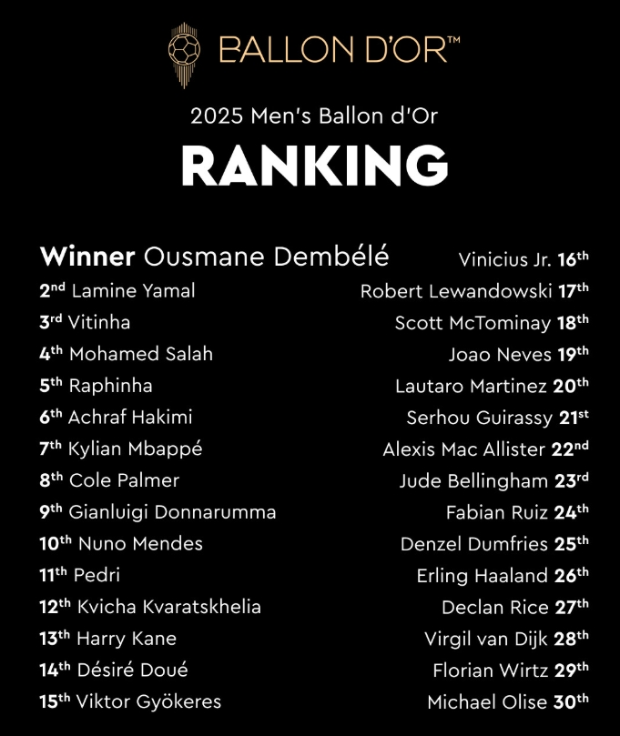 Ballon d'Or 2025 final results: Dembélé 1st, Yamal 2nd, Vintinha 3rd, Salah 4th