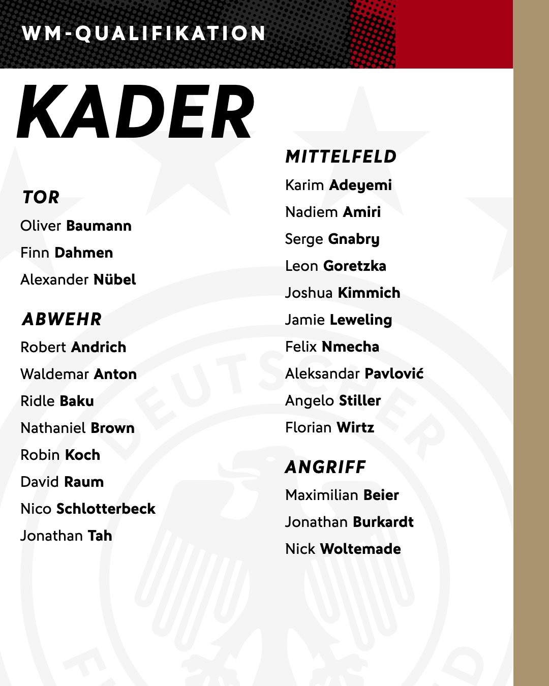 Germany head coach Julian Nagelsmann has announced the squad for the home fixture against Switzerland in Sinsheim on 10 October and the away match in Belfast on 13 October.