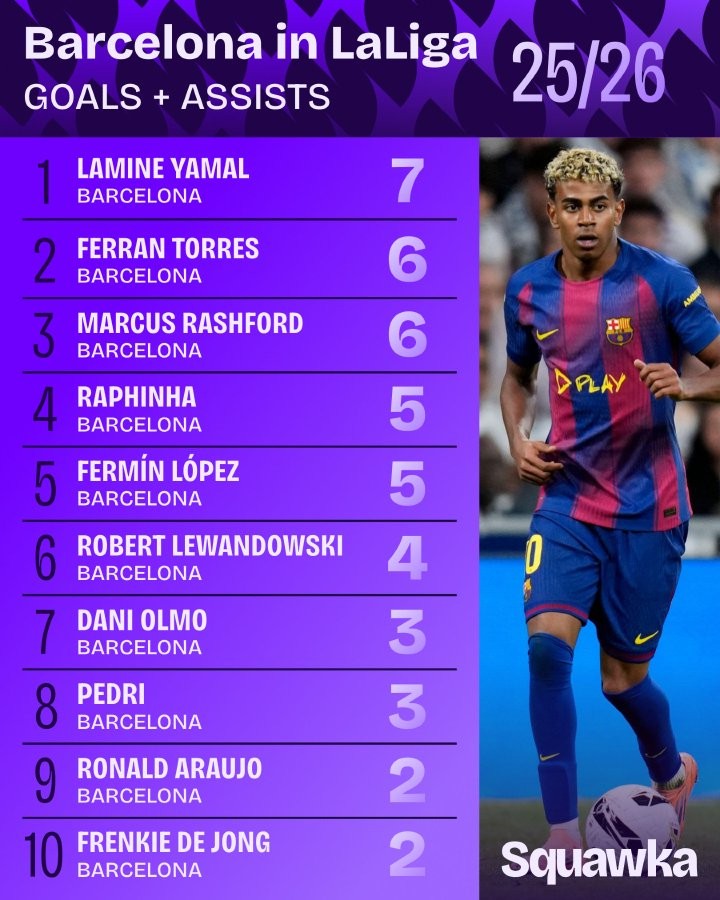 Barcelona are the only side in Europe's top five leagues to have five players with 5+ direct goal involvements in the league this season.