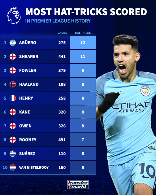The players with the most EPL hat-tricks: Aguero 1st, Haaland 4th